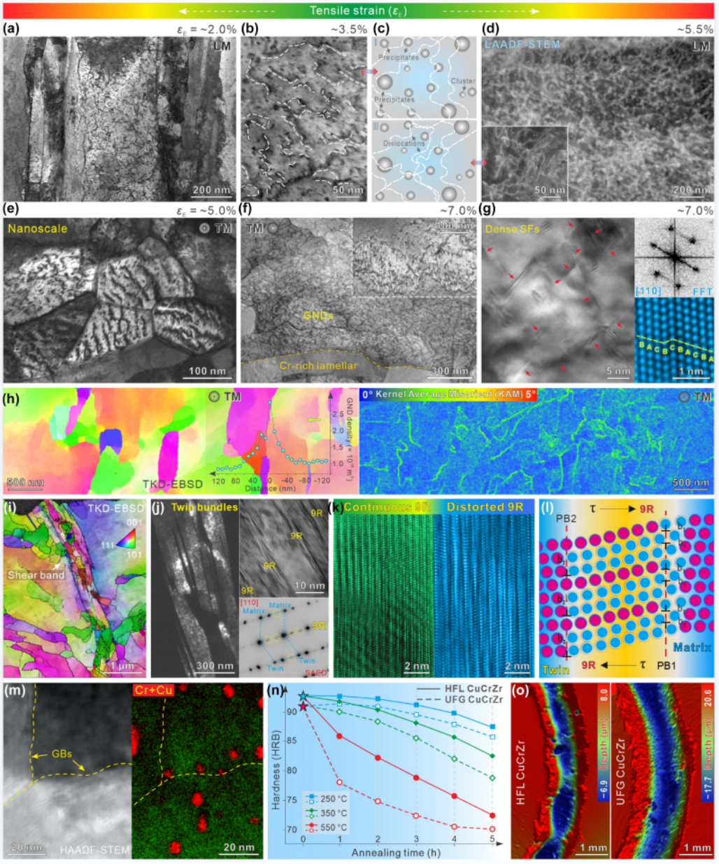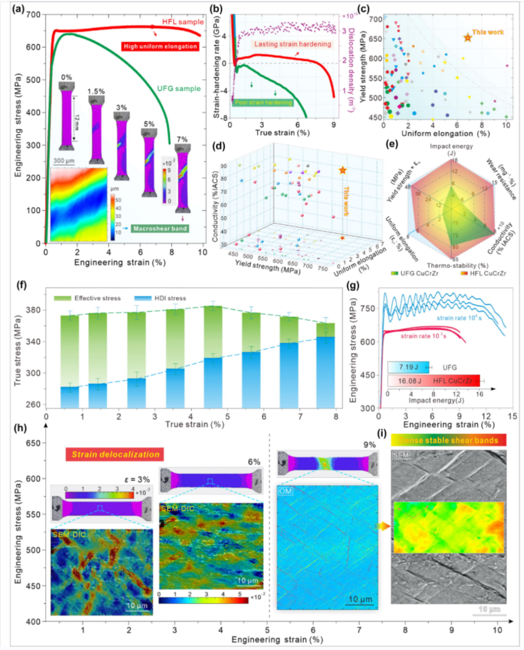 图4 优异的机械性能和独特的变形行为。a,UFG和HFL样品的拉伸曲线。图中插图为拉伸变形的原位DIC观察和UFG试样宏观断裂韧性的共聚焦激光OM观察;b,两个试样对应的应变硬化曲线和HFL试样位错密度的演变;c,HFL试样的屈服强度与均匀延伸率相对于先前报道的Cu Cr Zr材料(与我们的材料具有相同或几乎相同的成分);d,屈服强度和均匀延伸率与电导率相对于先前报道的Cu Cr Zr材料(与我们的材料具有相同或几乎相同的成分)为保证这些数据的合理性和准确性,根据这些文献,c和d中不包括少量由小尺度拉伸试样测得的高估性质。e,UFG和HFL样本的多个属性值或趋势。耐磨性用磨损失重的倒数来表示。热稳定性是指550℃退火3 h后的硬度与退火前硬度的比值。f,HDI应力和有效应力的关联演化。g,HFL样品的超高速和准静态拉伸曲线。插图显示了UFG和HFL的冲击能量Cu Cr Zr样品. h,HFL样品拉伸变形的多尺度耦合原位DIC观测. i,彩色OM和SEM图像显示致密、稳定的SBs .右图中的插图为共聚焦激光扫描显微图像,进一步显示并确认了流行的SB。