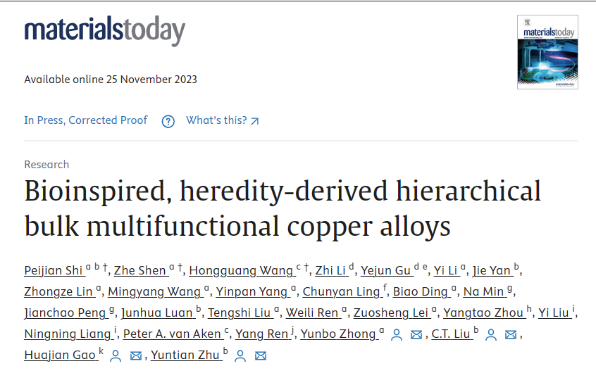 在此,上海大学、香港城市大学、德国马普所、中国科学院金属研究所、南京理工大学、新加坡南洋理工大学等国内外知名高校,研究了生物启发,遗传衍生的分级块状多功能铜合金。通过利用HFL结构使能的复杂内应力条件,激活了许多以前无法实现的变形和强化机制。它们在多倍长度的尺度上执行和相互作用,从强烈的多样化位错捕获、大规模堆垛层错增殖、9R相辅助的纳米孪晶、自缓冲剪切带到不断强化的异质形变诱导硬化。这些场景甚至创造了远超传统均匀结构的卓越的、应变率容忍的动态特性。枝晶在金属材料中普遍存在,但通常是不受欢迎的,而我们的"生物启发,遗传衍生"策略反直觉地利用了它们,实现了前所未有的高优值多功能性。相关研究成果以题“Bioinspired, heredity-derived hierarchical bulk multifunctional copper alloys”发表在金属顶刊Article In Press上。