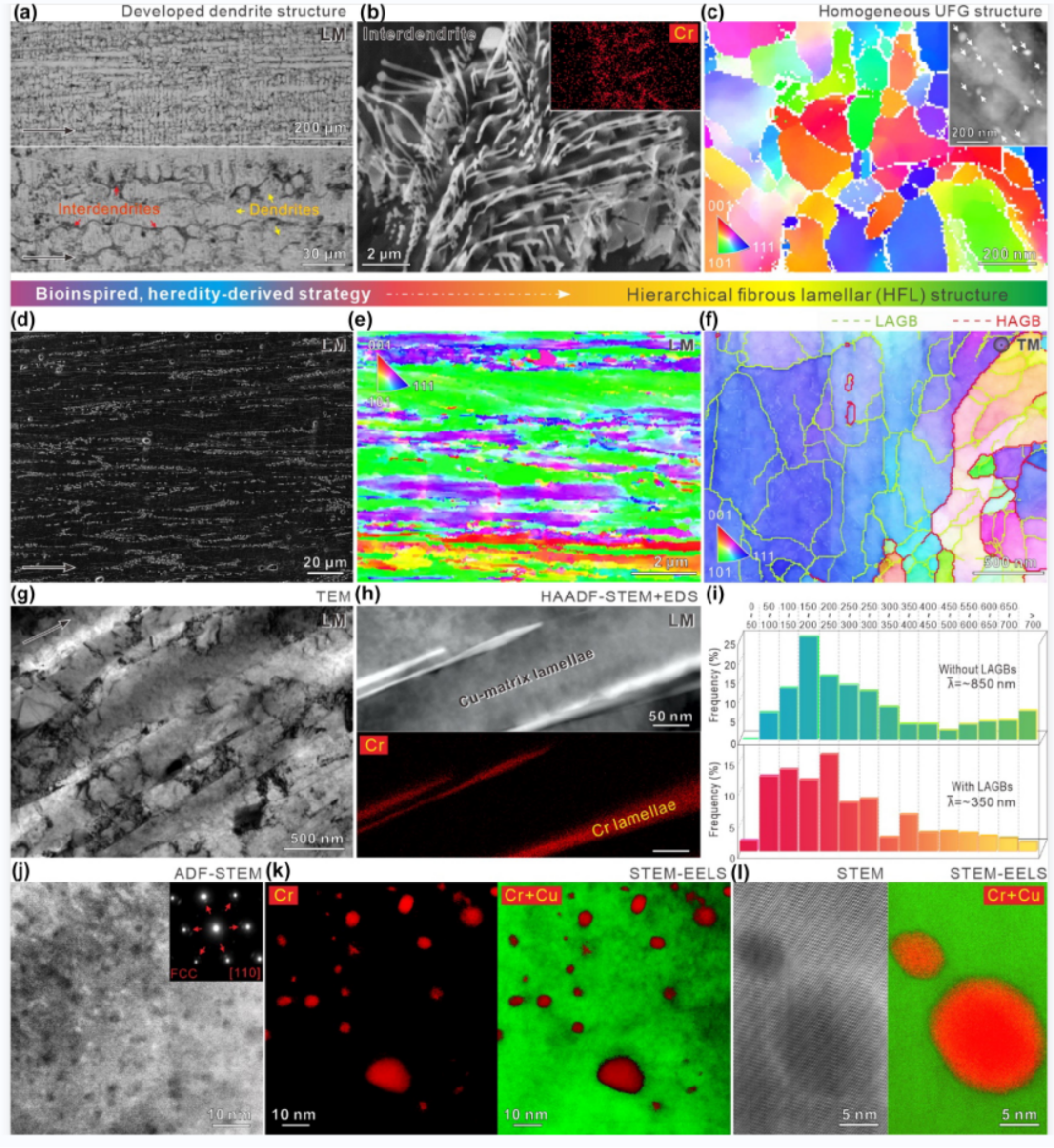 图1 受生物启发,遗传衍生的HFL结构。铸态CuCrZr样品的a,b,OM和SEM图像。插图显示了Cr偏析的直接作用和间接作用映射。c,作为参考材料的UFG ECAP样品的EBSD逆极图( IPF )图像。内插图显示了相应的情况HAADF - STEM图像,白色箭头标记致密的沿晶析出物。d-l,设计HFL样本。d-h,SEM,EBSD IPF,EBSD IPF,TEM和HAADFSTEM以及EDS映射图像。f,EBSD IPF图像识别广泛的LAGBs。LAGBs和HAGBs分别用绿线和红线标记。i,HAGBs (上层)和HAGBs + LAGBs (下层)的粒度分布。J,纳米析出相的ADF - STEM图像。k,Cr和Cu + Cr元素的STEM - EELS 映射。l,双峰析出相的Atomic - resolution STEM图像和STEM - EELS 映射。( a、d、g)中的箭头表示纵向方向。所有的LM和TM分别指纵向和横向微结构。