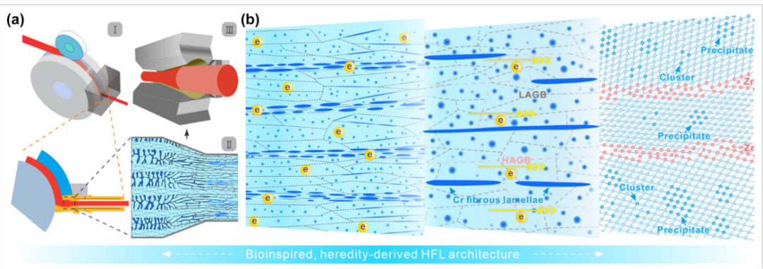 导读:生物启发的分层设计展示了一种有前途的微观结构解决方案,以避免人工材料中的多种复杂的性能权衡。然而,如何可行地、综合地调整结构层次,特别是对于块体材料而言,仍然具有极大的挑战性。在此,报道了一种反直觉的现象- -探索铸态块体合金中高度发展的树枝晶层次的多尺度微观结构遗传。在优化的热机械加工过程中,本文小心地控制这些枝晶逐渐变形、伸长、排列和细化,而不是像传统的合金加工范式那样完全破坏它们。因此,在具有技术重要性的Cu Cr Zr合金中可控设计了类似于贝壳和竹子的分级纤维状片层( HFL )结构。这种创新的HFL设计促进了具有连续多尺度相互作用和突出仿生属性的多种协同微观机制,从而提供了非凡的多功能性,特别是高强度-导电性的组合。