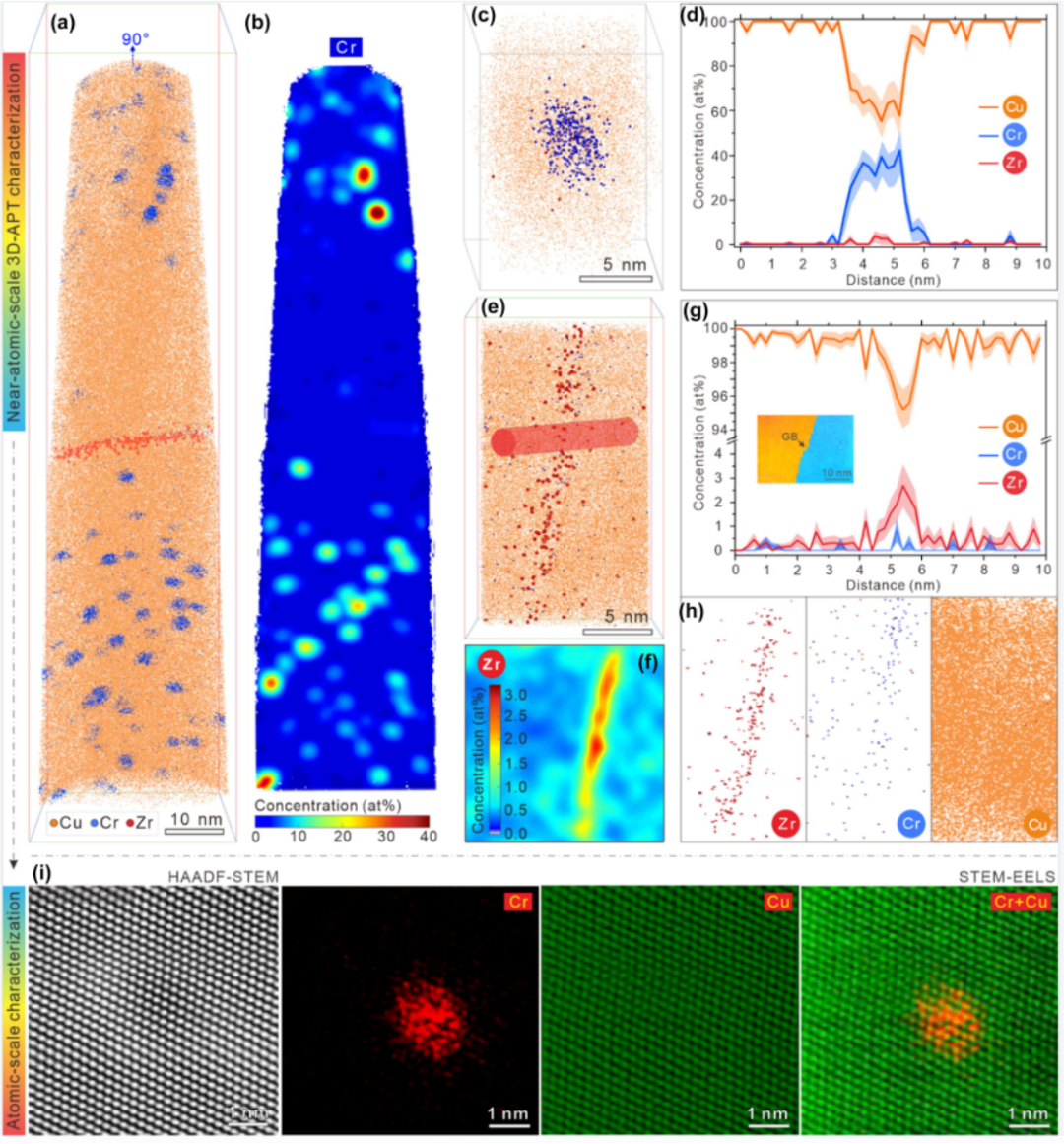 图2 多模态纳米析出相和界面元素偏析。a,近原子尺度的APT重建图显示铜基体中的多模态富Cr析出相和Zr元素在晶界处的分布。b,( a )中Cr浓度随90次旋转的二维等高线颜色轮廓。扩大的原子图显示富Cr沉淀( c )和Zr偏析修饰的晶界( e )。富Cr沉淀相( d )和穿过晶界的圆柱体( g )的一维成分轮廓。GB是指晶界。f,Zr浓度的二维等高线颜色轮廓( e )。h,Zr,Cr和Cu在晶界处的原子图。i,原子级HAADF - STEM图像和原子级分辨率STEM - EELS图像。