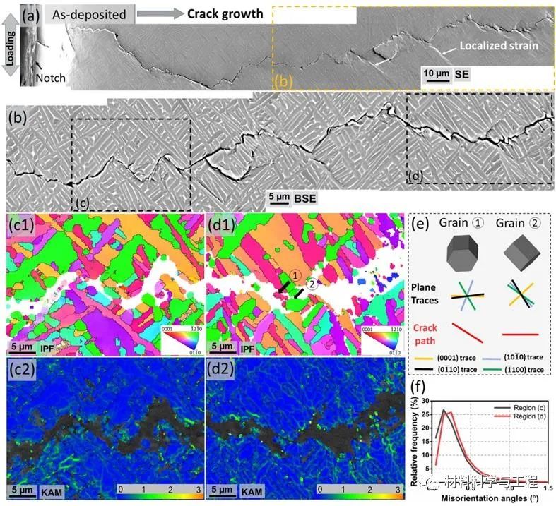 图3. 裂纹在热处理的钛合金中的扩展路径。主要是穿过alpha晶粒扩展,裂纹扩展过程中alpha晶粒的塑性变形大。