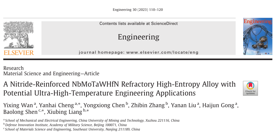如何让超高温合金既可耐高温又有高强度? 近日,中国矿业大学在超高温金属结构材料领域取得新进展。该校机电工程学院博士后万义兴与教授程延海研发出一种具有超高温工程应用潜力的氮化物增强铌钼钽钨铪氮难熔高熵合金。相关成果日前发表在中国工程院院刊《工程(英文)》上。