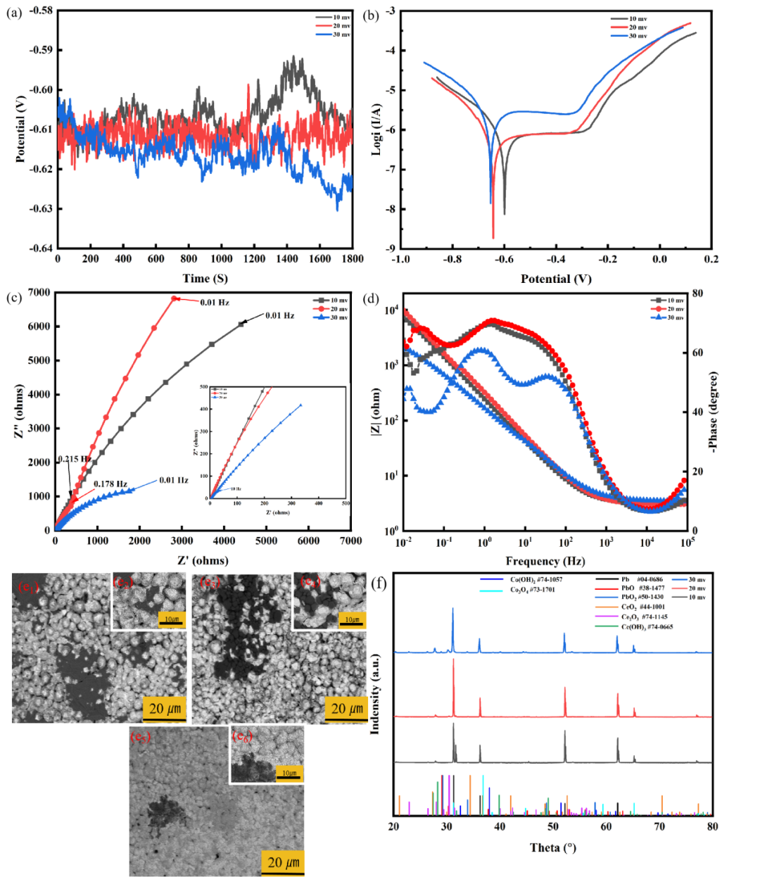 近期,西南科技大学材料与化学学院微尺度储能材料研究团队在合金涂层腐蚀领域取得新进展。研究人员全面探讨了铈掺杂的Pb-Co合金疏水涂层的腐蚀抑制机制。利用一步电镀工艺,成功制备了多种比例的铈掺杂铅钴合金疏水涂层。通过调节电镀溶液中钴和铈离子的比例,可获得具有独特表面形态、润湿特性和耐腐蚀性能的涂层。值得注意的是,当电镀溶液中铈离子与钴离子的比例设定为 2:1 时,所制备的涂层具有优异的疏水性,并表现出最高的抗润湿性。电化学阻抗光谱(EIS)测量显示,涂层在低频下的阻抗模量比未涂层基底的阻抗模量高出两个数量级。此外,即使在渤海海水中浸泡十天,涂层仍能保持强大的耐腐蚀性。