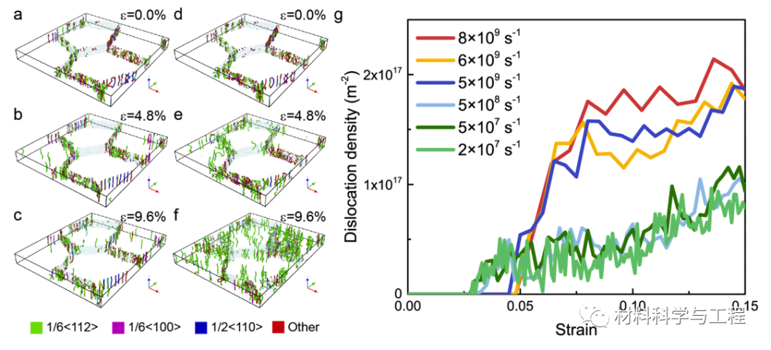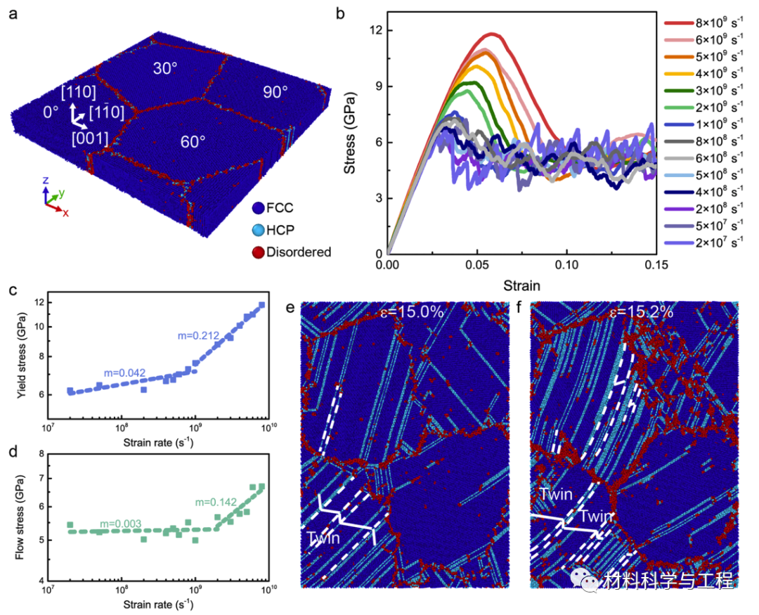 在过去的十年中,通过将接近等原子比(5%至35%)的多种元素(四种或更多)合金化到固溶体相中,提出并合成了一类新型合金,被称为高熵合金(HEA)。这种HEA策略打破了传统合金设计的局限性,大大拓宽了合金的设计空间。通过调整元素的成分或浓度,科学家可以调节 HEA 的微观结构,以进一步实现所需的机械性能。 HEA 表现出卓越的机械性能,如高强度、优异的延展性、高断裂韧性和良好的热稳定性。由于其独特的微观结构和化学成分,高熵合金(HEA)表现出卓越的机械性能,如高强度、优异的延展性和良好的热稳定性。然而,迄今为止,关于 HEA 动态行为的研究还很有限。来自北京理工大学和清华大学的学者通过结合力学测试和分子动力学模拟,系统地研究了CoCrFeNi HEA及其连接在动态加载下的力学行为和变形机制。对多晶CoCrFeNi HEA 样品在不同应变率下的压缩测试表明,屈服应力和流动应力均随应变率的增加而增加,并且由于HEA 的固溶强化和晶格畸变而表现出显着的应变率敏感性。 CoCrFeNi HEA 的应变率敏感性从低应变率 (5.0×10−5–2.5×103 s−1) 下的 0.010 转变为高应变率 (2.5×103–6.5×103s−1) 下的 0.333。大规模分子动力学模拟进一步揭示,这种转变与低应变率下的位错成核和滑移到高应变率下的大量位错成核和阻力的塑性变形机制转变有关。此外,CoCrFeNi HEA 在高应变率下表现出显着的应变硬化能力,这源于初级和次级纳米级孪晶以及孪生孪生和孪生位错相互作用的形成。我们目前的研究揭示了动态载荷下 HEA 的塑性变形机制,为设计和制造具有优异动态机械性能的 HEA 提供了指导。相关工作以题为“Dynamic deformation behaviors and mechanisms of CoCrFeNi high-entropy alloys”的研究性文章发表在Acta Materialia。图 1. CoCrFeNi HEA 块体的微观结构表征。 (a) HE-XRD 图案。 (b) 块状 CoCrFeNi HEA 的 EBSD 图图 2. CoCrFeNi HEA 在不同应变率下的单轴压缩行为。 (a) 不同应变率下的真应力-真应变曲线。 (b) 5%应变下屈服应力和流动应力随应变率的变化。 Al、Ni 和 Cu的数据用于比较。 (c) 不同应变下的流动应力随应变率的变化。 (d) 应变硬化率随真实应变的变化。图 3. CoCrFeNi在不同应变速率下变形后的显微组织。 (a, b) CoCrFeNi HEA 在真实应变为 16.2% 和 28.8%、应变率为 1×10−3 s−1时的 EBSD 图。 (c, d) CoCrFeNi HEA 在真实应变为 16.2% 和28.8%、应变率为 4.5×103 s−1时的EBSD 图。变形孪晶产生的孪晶边界呈蓝色。 (e) CoCrFeNi HEA 在不同应变率下真应变为 28.8% 时的取向差角分布。图 4. CoCrFeNi HEA 的 TEM 图像,在应变率为4.5×103 s−1时,真实应变为 28.8%。(a, b) 变形 HEA 中的双束。 (b) 中的插图显示了孪晶结构的选定区域电子衍射图案。图 5. MD 模拟中 CoCrFeNi HEA 的单轴压缩。 (a) 具有 4 个晶粒的模拟多晶样品的初始原子构型。 (b) 模拟样品在不同应变率下的应力-应变曲线。 (c, d) 屈服应力和流动应力随应变率的变化。 (e) 应变率为 15.0%、应变率为 2×107 s−1时模拟样品的原子构型。 (e) 应变率为 15.2%、应变率为8×109 s−1时模拟样品的原子构型。白色虚线表示多个纳米级孪晶的孪晶边界。白色实线表示矩阵和孪晶域中的原子排列。图 6. 模拟样品在不同应变率下变形过程中的位错演化。 (a-c) 应变率为 2×107 s−1 时模拟样品中位错分布的一系列快照。 (d-f) 应变率为 8×109 s−1时模拟样品中位错分布的一系列快照。 (g) 在不同应变率下施加应变时位错密度的演变。图 7. 移动位错密度和平均位错速度随应变率的变化。图 8. CoCrFeNi HEA 在不同应变率下真实应变为 16.2% 的肯尔平均取向误差 (KAM) 图。 (a) 应变率为1×10−3 s−1时 CoCrFeNi HEA 的 KAM 图。 (b) 应变率为4.5×103 s−1时 CoCrFeNi HEA 的 KAM 图。高角度晶界以黑线显示。图 9. 根据 MD 模拟,在应变率为 8×109 s−1的变形样品中形成分层孪晶。 (a) 晶界的位错发射。 (b-c) 初级孪晶 (T1) 的成核和生长。 (d-e) 二次双胞胎 (T2) 的成核和生长。 (f) 主要双胞胎和次要双胞胎之间的相互作用。白色和黄色分别代表主要和次要双胞胎。总之,本研究通过准静态/动态压缩测试研究了 CoCrFeNi HEA 在应变率范围从 5.0×10−5 s−1到 6.5×103 s−1的变形行为和相关机制。本研究还进行了 MD 模拟来补充实验并揭示潜在的变形机制。实验结果表明,随着应变速率的增加,多晶CoCrFeNi HEA的屈服应力和流动应力均显着增加。 5%应变下的流变应力的SRS从低应变率下的0.010转变为高应变率(2.5×103–6.5×103s−1)下的0.333 。实验分析和MD模拟相结合表明,这种SRS转变归因于从低应变率下的位错成核和滑移到高应变率下的大量位错成核和位错阻力的变形机制转变。此外,在高应变速率下,CoCrFeNi HEA 的应变硬化速率随应变的变化存在一个平台,表明高应变速率下具有显着的应变硬化能力。这种显着的应变硬化源于初级和次级纳米级孪晶以及孪生和孪生位错相互作用的成核和延伸。本研究结果提供了动态载荷下 HEA 塑性变形的机制见解。