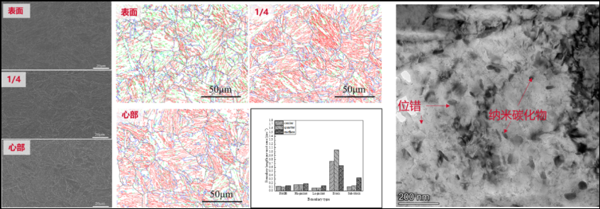 研究了钢板厚度方向的组织、析出相种类、大小、分布、演化过程,如图7,揭示了纳米析出相和位错结构在回火过程中的演变规律,在此基础上,建立工艺-组织/析出相-性能之间的精准调控关系。