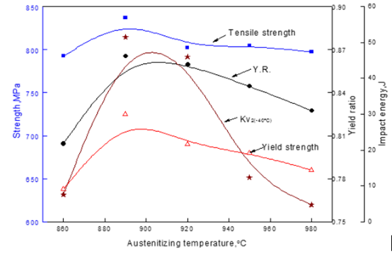 本项目研究了实验钢随着淬火温度的升高,其抗拉强度、屈服强度和低温冲击功先升高而后降低;在900℃左右达到最高值,高于或低于这一温度,强度和韧性都有所降低,且韧性变化更为明显;而且随奥氏体化温度的升高,屈强比先升后降,在900℃左右达到峰值,如图5所示。