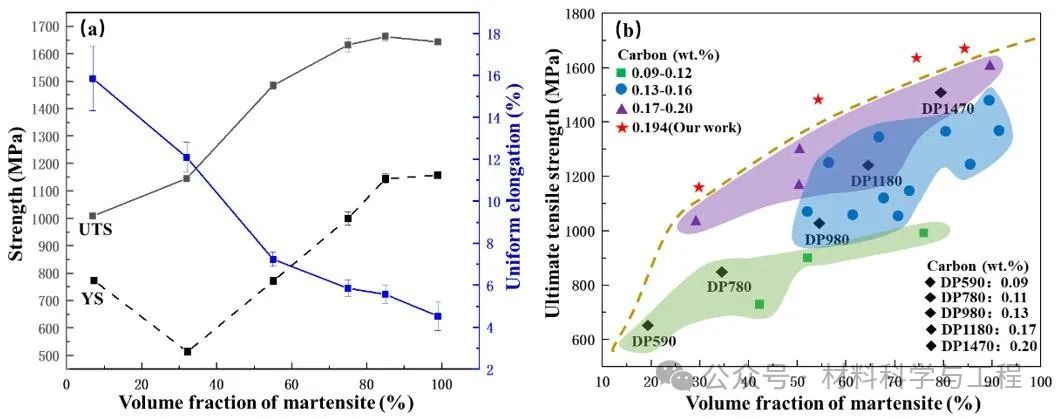 双相(DP)钢作为一种先进高强钢(AHSS),因其优异的力学性能及低廉的价格被广泛应用于汽车行业。为满足新能源汽车对车身轻量化日益增长的需求,超高强度 DP 钢的抗拉强度 (UTS) 已达到 1470 MPa,与热成形钢22MnB5(PHS1500)的抗拉强度接近。目前为止,提高马氏体体积分数是提升DP钢强度最有效的方法之一。然而,随着马氏体体积分数的增加,DP钢的抗损伤性能发生显著恶化。简而言之,强度与抗损伤性能不可兼得是目前超高强DP钢发展和应用的瓶颈。