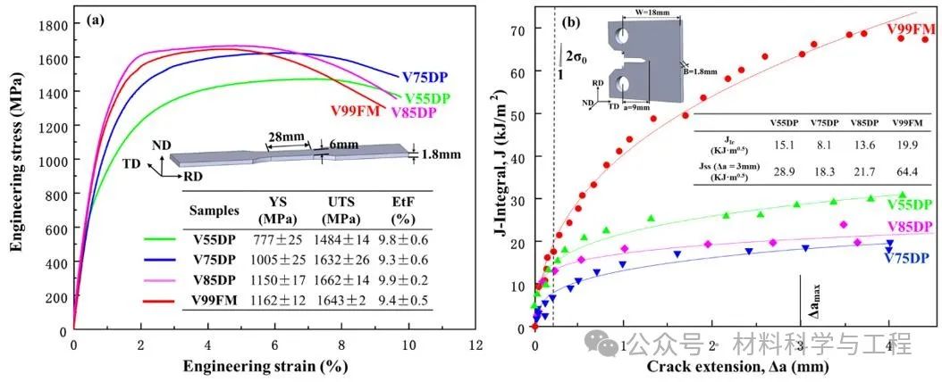 图3. 实验超高强DP钢的拉伸及断裂性能: (a) 工程应力应变曲线; (b) J-R曲线。