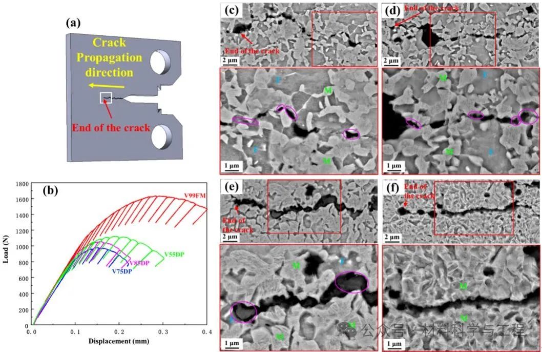 图4. (a) 取样部位示意图; (b) 中断样品载荷位移曲线; 中断样品裂尖放大SEM图: (c)V55DP、(d)V75DP、(e)V85DP、(f)V99FM。