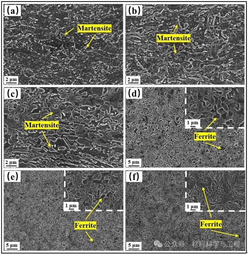 图1. 不同临界区热处理工艺下实验钢的SEM图: (a) 715℃10分钟、(b) 735℃10分钟、(c)755℃10分钟、(d) 775℃10分钟、(e) 795℃10分钟、(f) 815℃10分钟。