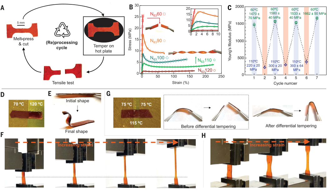 在生物学领域,干细胞因其能在特定条件下分化为多种功能细胞而备受瞩目。受此启发,科学家们长期致力于通过创造一种多能或“干”聚合物,这种聚合物能够通过外部刺激分化成一系列具有不同特性的不同材料。虽然化学改性一直是改变聚合物性质的主要工具,但是需要额外的材料介入,对资源稀缺地区造成了负担。而在大多数环境中最容易获得的刺激是热。例如,冶金学家通过回火、淬炼等的工艺将钢的机械性能进行有效改性,使其能够满足从刀具到桥梁等不同需求范围。受此启发,如果将具有室温动态thia-Michael键的聚合物网络进行加热控制和冷却循环回火,或许可以获得具有强大机械性能的聚合物薄膜。
