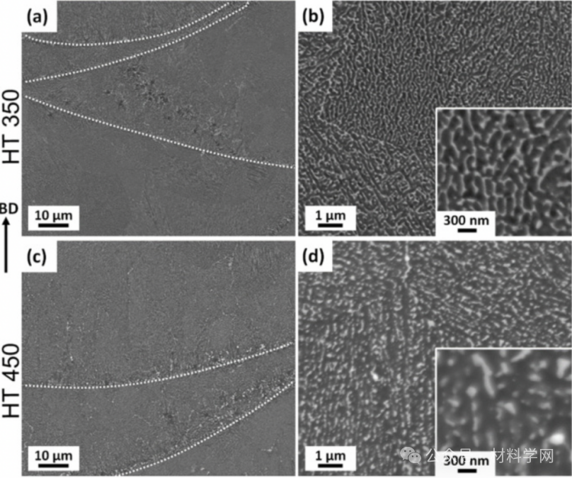 图 3. 在 (a, b) HT350 和 (c, d) HT450 条件下共晶凝固微观结构的 BSE-SEM 图像。(a、c)低倍放大图,熔池边界用白点线标出;(b、d)多晶粒高倍放大图,插入物显示共晶形态。