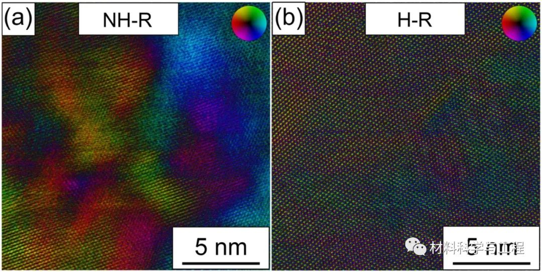 图5 (a)和(b)分别取自NH-R和HR样品的典型微分相位对比图,显示了由局部成分异质性引起的局部电场方向和幅度的变化。