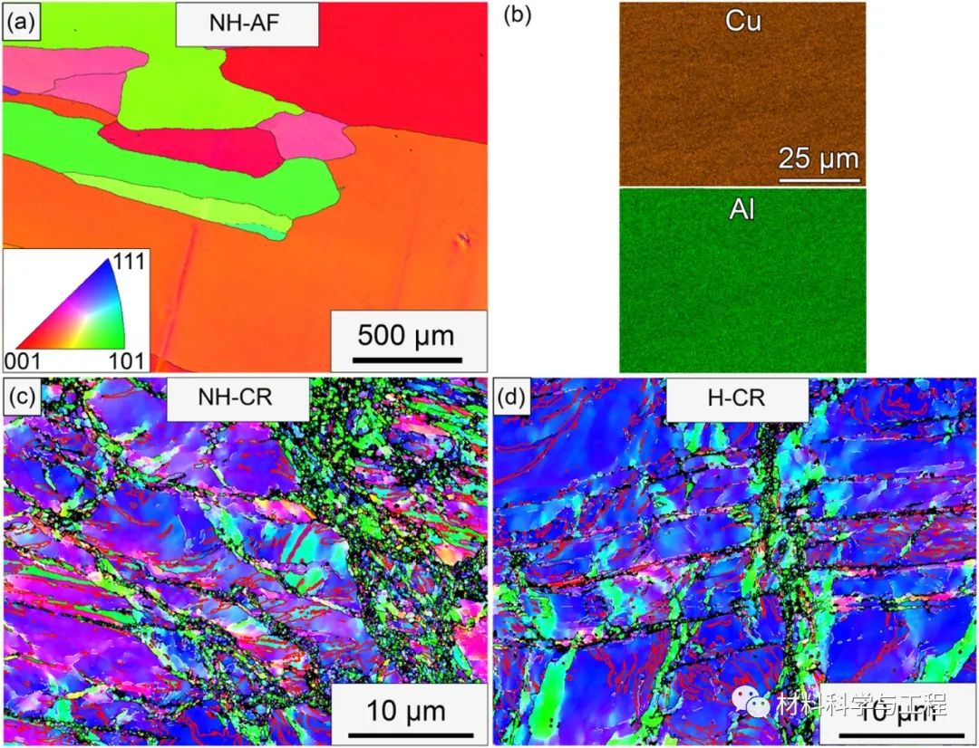 图3 (a)典型的EBSD IPF图和(b)NH-AF样品相应的SEM-EDS图,(c)和(d)分别是NH-CR和H-CR样品的EBSD IPF图。