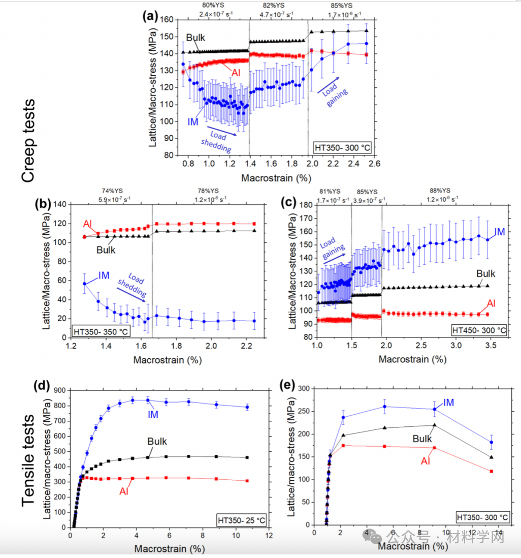 图 9. 原位中子蠕变数据显示了金属间第二相与铝基体之间的载荷传递行为:(a-c)在 300°C (a, c) 和 350°C (b) 下进行应力跃迁蠕变测试时,(a, b) HT350 和 (c) HT450 各相的晶格应力与蠕变大应变的对比图。(d, e) HT350 在 (d) R.T.和 (e) 300°C 下进行拉伸试验时各相晶格应力与宏观应变的对比图。IM 代表 Al27Ni6Ce3 金属间第二相。对于蠕变试验(a-c),施加的宏观应力以屈服应力的百分比(%YS)表示,并显示了每个应力水平的宏观蠕变应变率(s-1)。误差条代表平均值的标准误差。