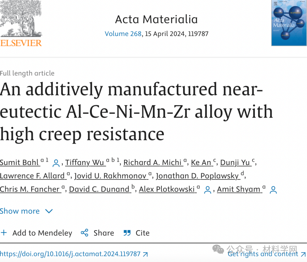 相关研究成果以“An additively manufactured near-eutectic Al-Ce-Ni-Mn-Zr alloy with high creep resistance”发表在Acta Materialia上。