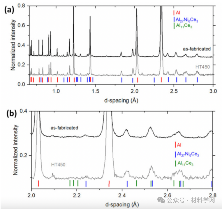 图 4:(a) 原状和 HT450 条件下的中子衍射图样,显示在 450°C、2 小时热处理条件下未发现相变。(b) (a) 中的衍射图样放大图,显示出与 Al11Ce3 相匹配的极小峰值。