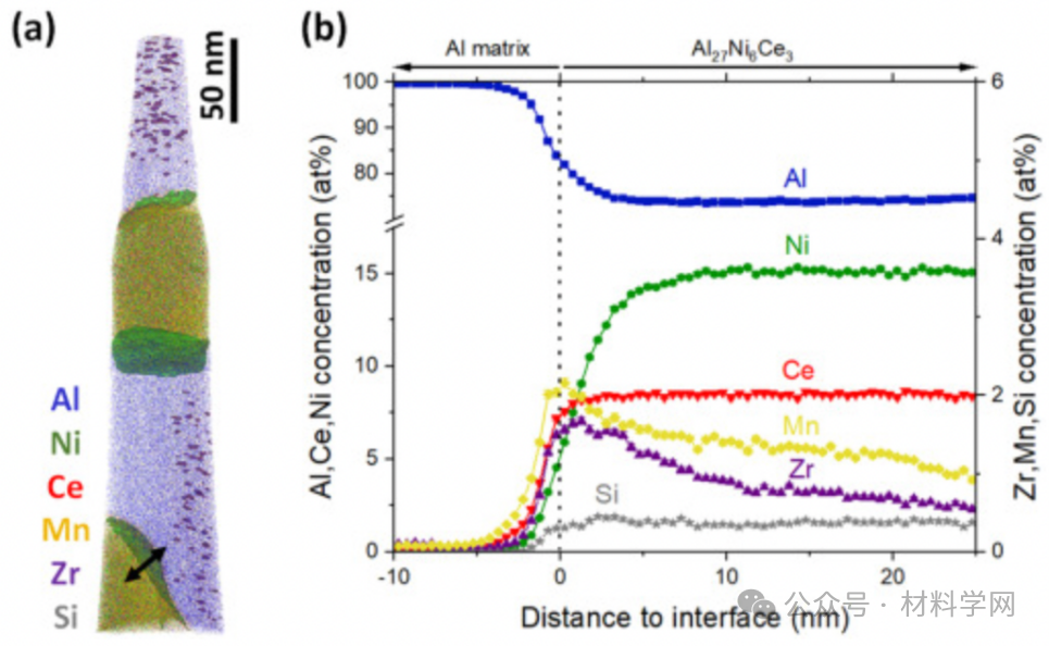 图 2. (a) APT 尖端(HT350)的三维重建图,绿色和紫色分别表示 5 at% Ni 和 2 at% Zr 的等浓度表面。(b) 在三个不同的基体/第二相界面区域的单个元素分布平均接近直方图,(a)中箭头所示为其中一例,证实第二相成分为 Al27Ni6Ce3。