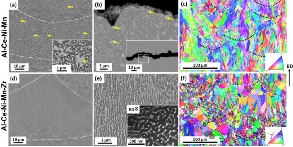 图 1. 坯料(a-b)Al-Ce-Ni-Mn 和(d-e)Al-Ce-Ni-Mn-Zr 合金的显微结构。BSE-SEM 图像(a) 放大倍数较低,插图放大倍数较高,显示出富含锰的莲座状金属间化合物颗粒(用黄色箭头标出,图 S1 中的 EDS 图证实了这一点);(b) 显示了合金中的裂纹(插图中放大倍数较低的图像),该裂纹是在从构建板中移除后形成的,与富含锰的莲座状金属间化合物有关。(c) 复制自先前工作的应力再生 (HT450) Al-Ce-Ni-Mn 合金的 IPF 图,显示合金中的柱状晶粒结构。(d)低倍和(e)高倍(熔池中心)的 BSE-SEM 图像显示了共晶结构,(f) IPF 图显示了制造完成的 Al-Ce-Ni-Mn-Zr 合金中的等轴晶粒结构。(e) 中的插图是共晶凝固微观结构的高角度环形暗场 (HAADF) -STEM 图像。(a)、(c)、(d)和(f)中的曲线虚线标记了熔池边界。BD 表示构建方向。