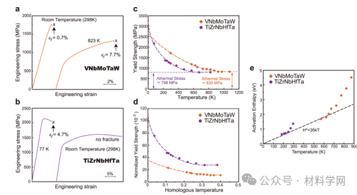 1所示。ab VNbMoTaW (a)TiZrNbHfTa (b)在低于和高于各自BDTTs的温度下压缩变形的应力-应变曲线。除TiZrNbHfTa在室温下发生断裂外,其余均发生断裂;相应的断裂应变(εf)在图中标注。c, d屈服强度与温度的关系(c),剪切模量归一化屈服强度与同源温度的关系(T/Tm) (d),位错运动激活焓与温度的关系(e)