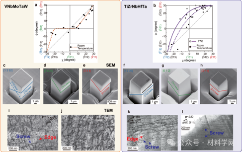 2所示。c - e沿(c)(d)(e)加载后的典型变形微柱。f - h沿(f)(g)(h)加载后的典型变形微柱。ij沿(i)(j)加载后的典型变形微柱的亮场TEM图像。在室温(k)77 k (l)下,TiZrNbHfTa滑移后典型变形微观结构的亮场TEM图像。(k)的薄片平行于沿孪晶方向变形的微柱试样的宏观滑移面切割。为了比较,(l)从变形的块状多晶体上平行于同一平面切割。