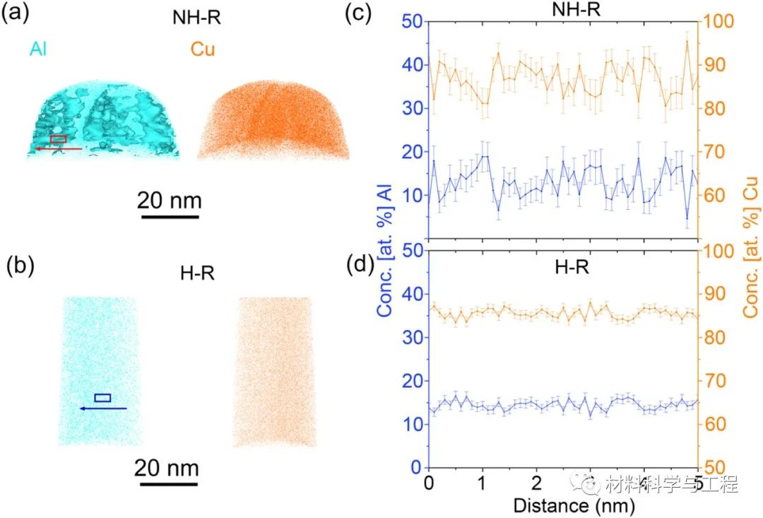 图4(a)NH-R样品中Cu、Al原子分布图,(b)HR样品中Cu、Al原子分布图,(c)是(a)中红方框区域的一维浓度分布,(d)是(b)蓝方框区域的一维浓度分布。