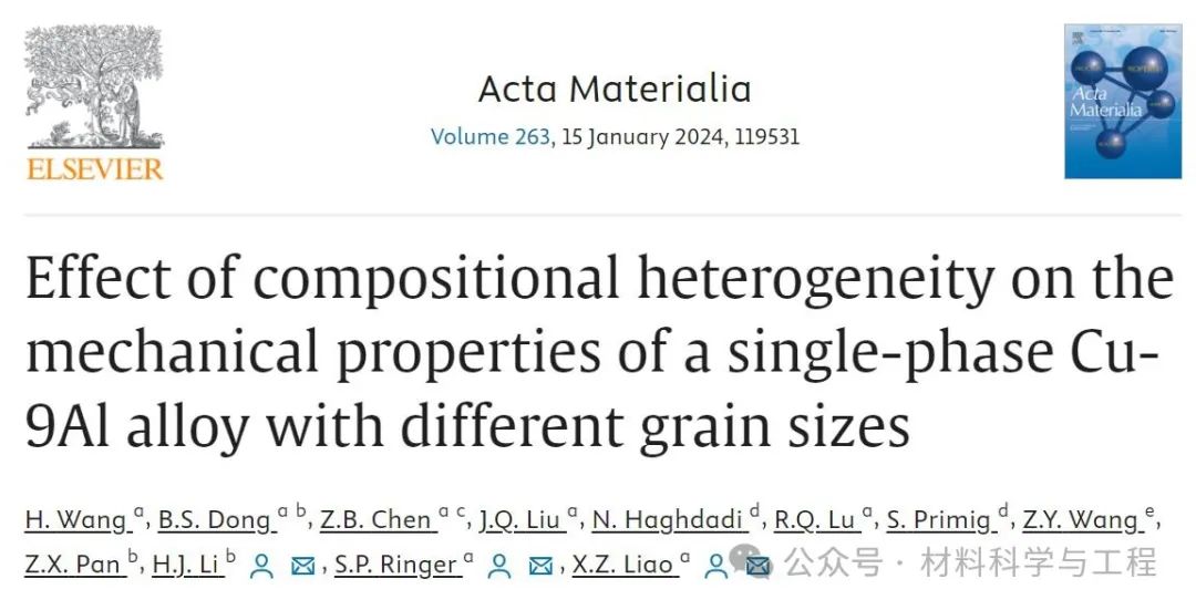悉尼大学廖晓舟教授团队将此工作以“Effect of compositional heterogeneity on the mechanical properties of a single-phase Cu-9Al alloy with different grain sizes”为题发表在金属材料旗舰期刊《Acta Materialia》上。
