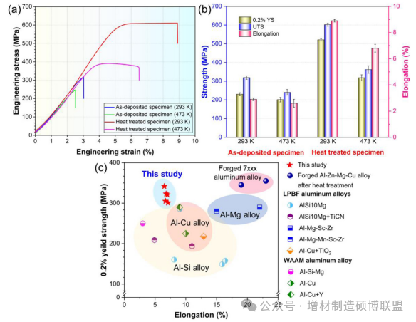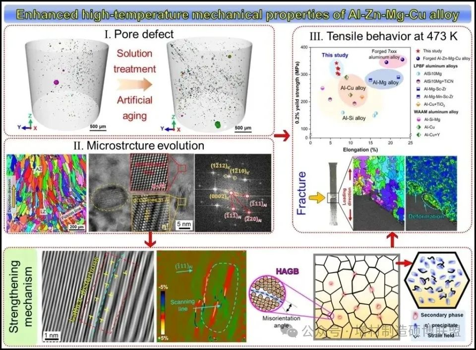 研究人员开发了形性联合调控的增材与后续热处理工艺,发现了Al-Zn-Mg-Cu合金“成分-相变”联合强化机制:共格纳米析出相剪切强化机制阻碍位错运动。基于热力学和动力学理论,计算了析出相溶解、形核生长临界条件,并探讨高温拉伸后微观组织与力学性能演变机理。复合增材制造Al-Zn-Mg-Cu合金样件的常温抗拉性能>600 MPa,高温抗拉性能>360 MPa,优于单一激光或电弧增材制备的Al-Zn-Mg-Cu、Al-Cu以及Al-Mg合金,能够与常规锻造的7075铝合金相媲美。这些发现为高性能轻质合金制造提供了一种全新的思路。