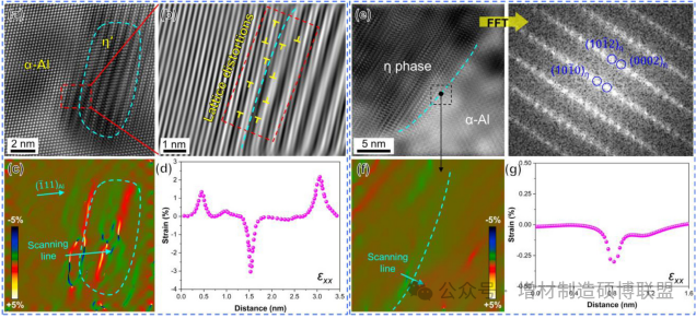 图11. (a) 经热处理标本中η'沉淀的HRTEM图像;(b) (a)的对应逆FFT;(c) (a)对应的计算应变图(εxx);(d) 从(c)中沿箭头方向提取的应变分布;(e) 沉积状态标本中η相的HRTEM图像和FFT图案;(f) (e)虚线框中对应的计算应变图(εxx);(g) 从(f)中沿箭头方向提取的应变分布。