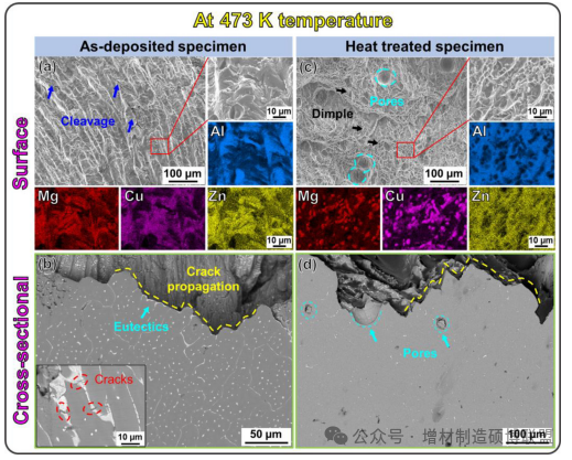 (4) 沉积状态的标本呈现脆性断裂,裂纹更倾向于沿着聚集的共晶传播。由于高温下的拉伸加载,一些晶粒倾向于滑移和变形,经过热处理后,塑性变形更大。裂纹传播主要发生在经热处理标本中具有更多孔隙的区域。