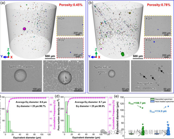 图2. 在Al-Zn-Mg-Cu合金中的孔隙分析,显示了从XCT重建的形态和分布:沉积状态下的孔隙形态的3D可视化(a)和经热处理标本(b);沉积状态下等效直径的频率分布(c)和经热处理标本(d);(e)等效直径的分布。