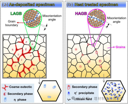 图12. 示意图,展示通过热处理实现的微观结构控制:(a) 沉积状态标本;(b) 经热处理标本。