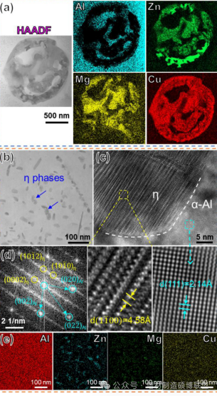 图6. 沉积状态的Al-Zn-Mg-Cu合金中不同相的透射电子显微镜(TEM)结果:共晶的HAADF图像和元素分布(a),η相的TEM图像(b),高分辨透射电子显微镜(HRTEM)图像(c),FFT图案(d),以及η相的EDS映射(e)。