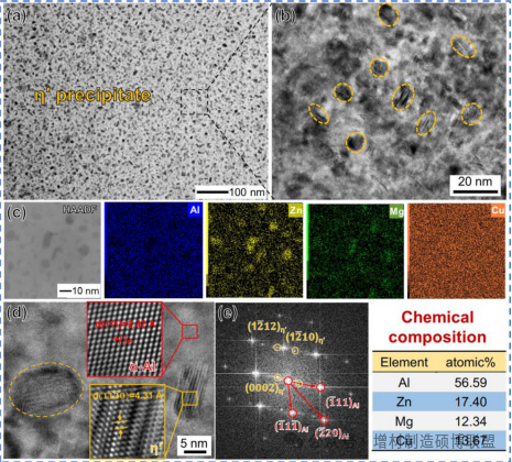 图7. 经过热处理的Al-Zn-Mg-Cu合金中的沉淀特征:BF-TEM图像(a),HRTEM图像(b),EDS映射(c),放大的HRTEM图像(d),(e)FFT图案和η'沉淀的化学组成。