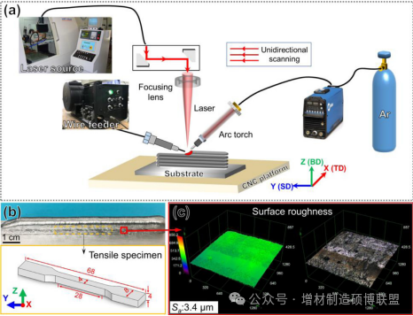 图1. (a) LAHAM系统;(b) 沉积的Al-Zn-Mg-Cu标本的宏观照片和拉伸标本的尺寸;(c) YOZ平面的表面轮廓。