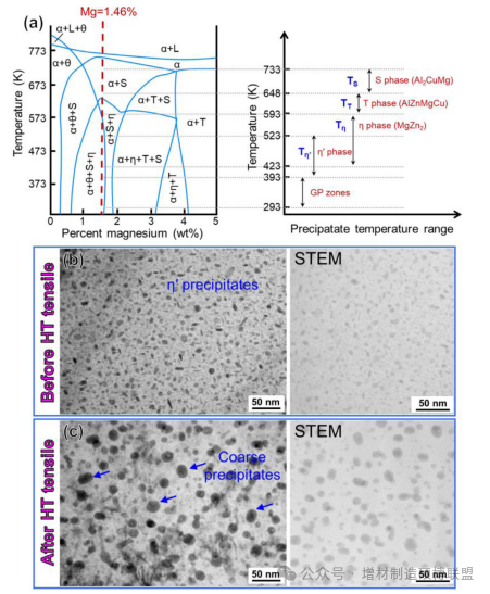 图10. (a) Al-Zn-Mg-Cu合金的相图[49]和相应的沉淀温度范围;(b) 经热处理标本在高温拉伸实验前后的BF-TEM和STEM图像。