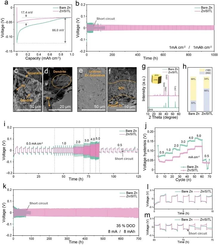 为了评估电池在苛刻条件下的稳定性,进行了倍率性能和放电深度(DOD)测试。倍率性能测试显示,Zn/SITL电池的电压曲线更加稳定,电压滞后现象更少(图4i和j)。在DOD测试中,在8.0 mA、8.0 mAh和35% DOD的对称电池条件下,Zn/SITL电池表现出显著的循环稳定性(超过700小时)电压滞后很小,而裸锌电池在71小时后失效,电压波动显著(图 4k)。