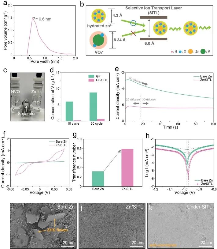 为探讨选择性离子传输层(SITL)的孔径对电解质中离子运动的影响,测量了MOF-801纳米粒子的比表面积和孔径分布。结果表明其结构以微孔为主,孔径为6.0 Å(图2a)。通过在锌金属阳极表面均匀涂覆SITL,形成了稳定的4.30 Å大小的水合锌离子通道,有效抑制了锌枝晶的形成(图2b)。6.0 Å孔径的SITL成功阻止了VO2+的迁移,从而有效地预防了锌金属阳极的腐蚀。通过H-cell验证了SITL阻挡了钒离子。