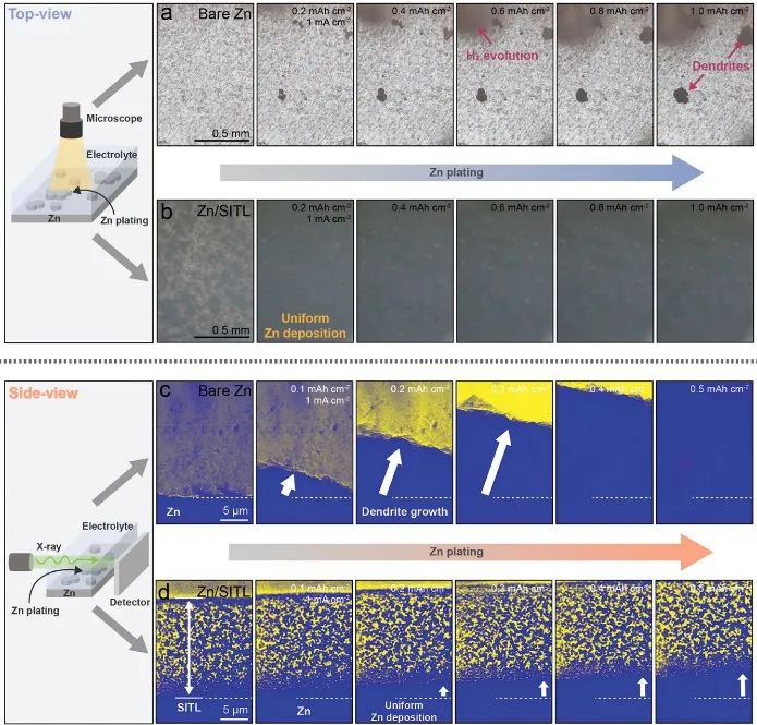 在对称电池上通过计时电流法(CA)研究了锌的沉积(图2e)。在-0.15 V的外加电压下,裸锌电极形成了不均匀的锌枝晶。相反,Zn/SITL电极在二维扩散18秒后保持了稳定的电流密度,形成了均匀的三维扩散层,最终实现了均匀的锌沉积。