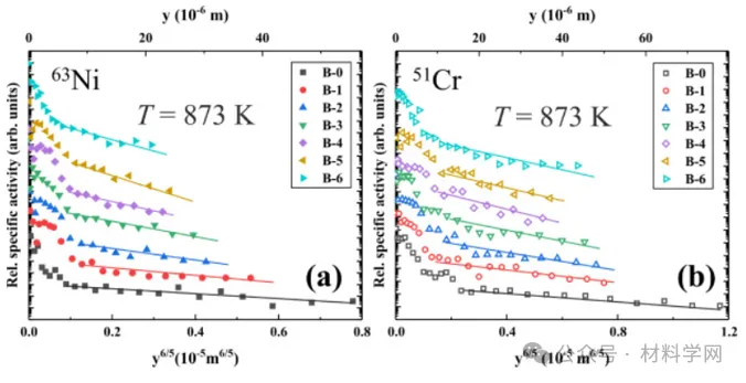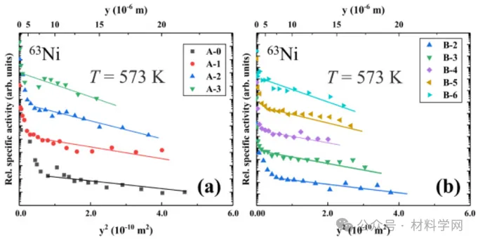 图8 在C型动力学状态(在573 K下扩散退火72小时)条件下测定的具有不同热暴露时间的C-22合金A组(a)组和B组(b)样品中63Ni扩散的放射性示踪剂渗透曲线。[数学处理错误]是穿透深度,实线表示拟合的晶界扩散分支。合金标签在表2中进行了说明。