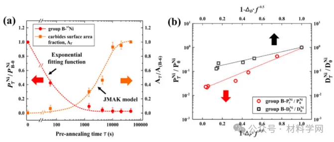 图10 (a)在1123 K下预退火不同时间的B组试样中析出GBs的估计分数与三重乘积的相对值的热暴露时间依赖性[数学处理误差](B-0)用于 B 组样品中的 63Ni GB 扩散。(b)金属碳化物归一化表面积之间的相关性 [数学处理误差]和确定的三重乘积的相对值 [数学处理误差]和 GB 扩散率 [数学处理误差]在 B 组样本中。