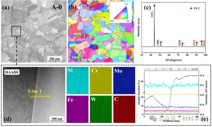 图1 Ni-Cr-Mo合金在1423 K退火48 h后(样品A-0/B-0,见表2)的显微组织,显示了(a)BSE图像和(b)相应的EBSD晶粒取向图,突出显示了高角度晶界,并用黑线,(c)XRD图显示了Ni-Cr-Mo合金在固溶热处理后的单个FCC相,(d)图(a)中标有黑色方块的相关区域所选HAGB的高倍率HAADF显微照片,以及近GB区域的相应STEM EDS元素图。(e)穿过所选 GB 的相关线扫描轮廓用(d)中的金色箭头表示。