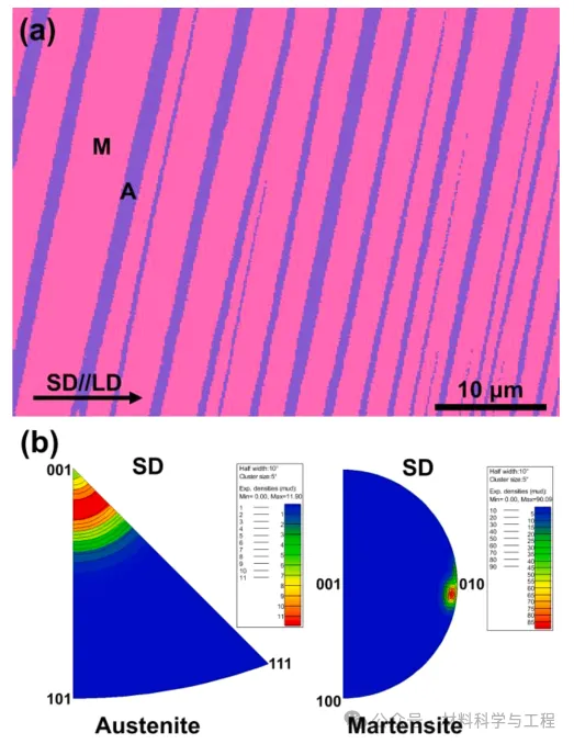 图 6. (a) 定向凝固的 Ni27Cu21Mn46Sn6合金在沿 SD 施加 5%压缩应变时,奥氏体和应力诱导的 6 M 马氏体共存的原位 EBSD 图。(b) 奥氏体和应力诱发的 6 M 马氏体与 SD 的反极值图。