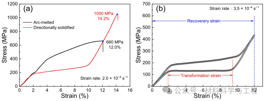 图 5. (a) 在室温(300 K)下测量的电弧熔化和定向凝固Ni27Cu21Mn46Sn6 合金在压缩条件下的断裂应力-应变曲线; (b) 在室温下测量的定向凝固 Ni27Cu21Mn46Sn6 合金在压缩条件下的超弹性响应。