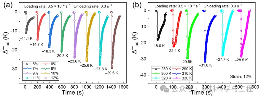 图 10. (a) 在室温下以 0.3 s-1 的卸载速率去除各种压缩应变时的应力引起的温度变化。(b) 在不同测试温度下消除 12% 压缩应变时的温度变化。