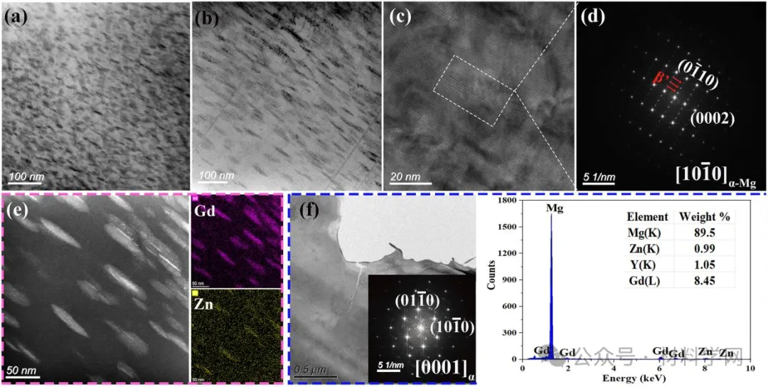 图5所示。峰值时效时基体的BF-TEM显微照片(z=[100]α-Mg):(a)UT 1中的β'相,(B)UT 3中的β'相;(c-d)β'相的HR-TEM和FFT显微照片;入射电子束平行于[100];(e)UT 3中β'相的HAADF-TEM和EDS图。(f)在平行于[0001]α-Mg的入射电子束下,固溶态基体的BF-TEM、FFT和EDS点。