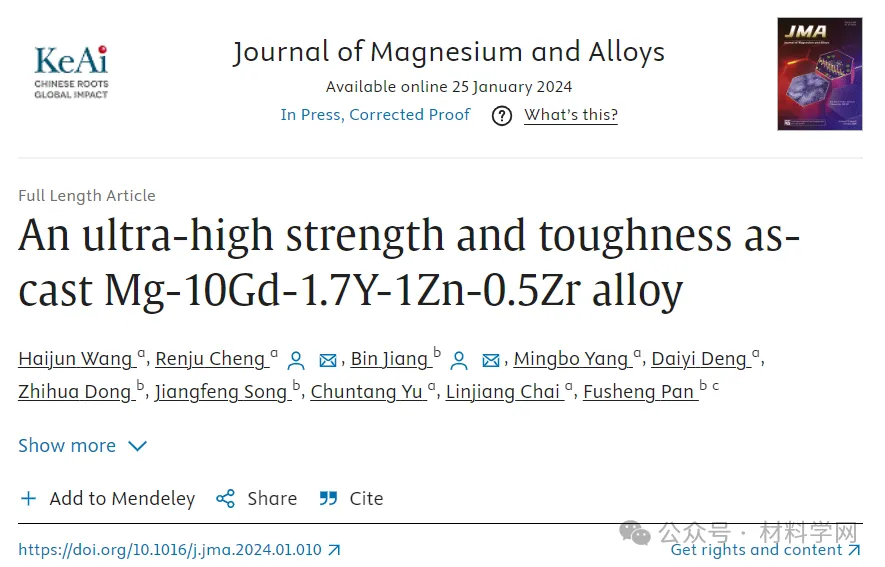 相关研究成果以“An ultra-high strength and toughness as-cast Mg-10Gd-1.7Y-1Zn-0.5Zr alloy”发表在Journal of Magnesium and Alloys上