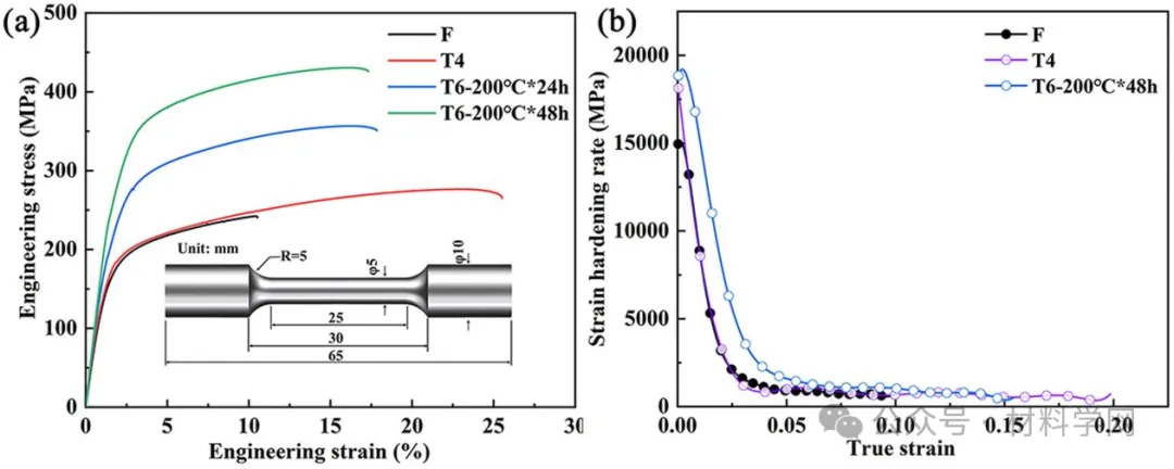 图2所示。(a) UT3的工程应变-应力曲线,(b) UT3的加工硬化曲线。