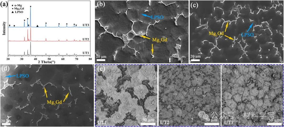 图3所示 。(a) UT1、UT2和UT3铸态合金的XRD图谱;SEM 显微照片显示了以下铸态微观结构:(b) UT1,(c) UT2,(d) UT3;(e)相同时效处理(480 ℃*12 h+200 ℃*48 h)下UT1、UT2和UT3的OM显微照片。